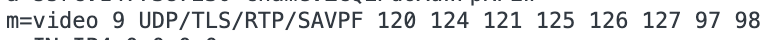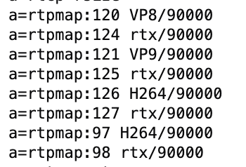 바로 이부분이다. m=video 9 UDP/TLS/RTP/SAVPF문우 뒤의 숫자 순서대로 우선순위를 가지며 사용가능한 코덱을 나열해 놓은 것이다. 해당 번호가 어떤 코덱인지는 스크롤을 내리면 아래쪽에 나와있다.